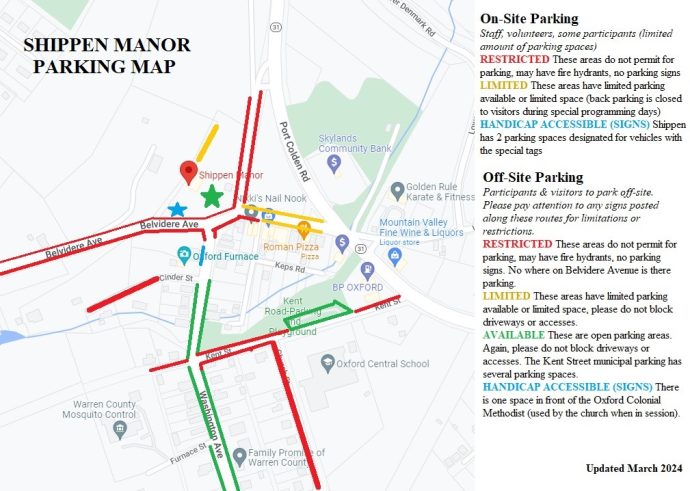 Warren Co. Cultural & Heritage Affairs at Shippen Manor is not responsible if a driver receives a ticket for parking in a no parking, limited parking, or block residents’ driveways. Please adhere to all signs.